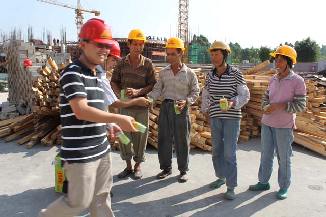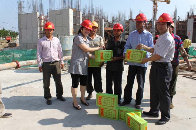 貫徹安監總局辦公廳、衛生部辦公廳、人力資源和社會保障部辦公廳、中華全國總工會辦公廳關于進一步做好夏季防暑降溫工作的通知精神,保障我公司集團員工在高溫天氣情況下安全順利的開展各項施工工作,公司黨委書記張解矛、工會副主席高迎春、行政中心副主任梁沛瑩、工程管理中心鄭國燦等同志于7月23日下午來到了金輝華綜合大樓施工現場,對一線施工人員在炎熱高溫環境下工作的情況進行了親切的慰。